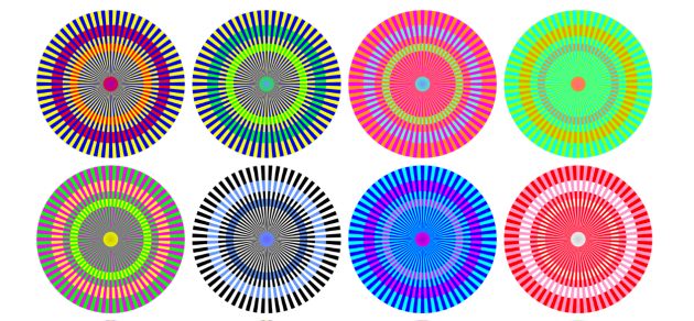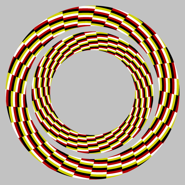 Ці кільця обманюють тричі. По-перше, якщо подивитися на картинку, здається, що внутрішнє кільце стискається, а зовнішнє розширюється. По-друге, спробуйте відсунутися від екрану і знову наблизитися до нього. Під час руху кільця обертаються в протилежних напрямках. По-третє, ці кільця ще й змінюють відтінки. Якщо дивитися на картинку близько і зосередити погляд в центрі – внутрішнє кільце здасться більш червоним, ніж зовнішнє, і навпаки.
