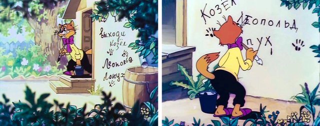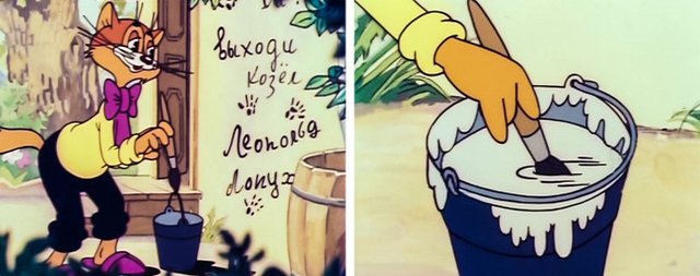 У цій же серії є ще один цікавий момент. Для того, щоб зафарбувати образливі написи, Леопольд приносить відро, на якому не видно і сліду фарби. Але на наступному ж кадрі крупним планом ми бачимо вже зовсім іншу картину.
