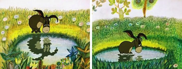 В одній зі сцен природа біля ослика Іа змінюється прямо на очах. Спочатку ставок, де стоїть герой, оточували тільки трава і квіти, а потім до них раптово додалися дерева. А слідом різко пропали квіти з переднього плану. Справжня магія!