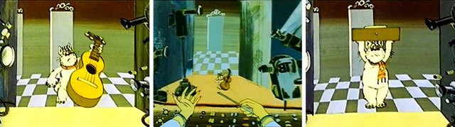 Коли кіт приймає відчайдушне рішення прийти на телебачення і заспівати для своєї улюбленої кішечки, ми добре бачимо, що співати він почав прямо в коридорі. Однак коли нам показують загальний план, кіт раптом переміщається на середину студії. А слідом – на крупному плані – кіт знову стоїть в коридорі.