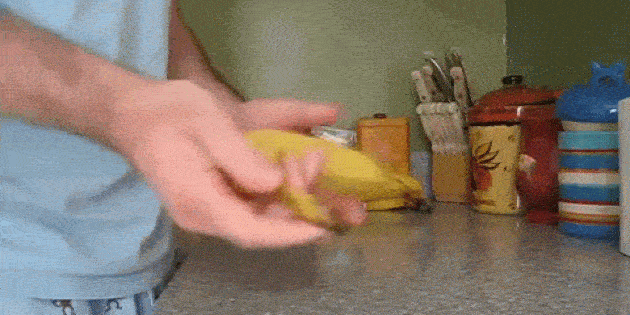 З якого боку чистити банан – предмет постійних суперечок. Кажуть, що правильно відкривати його, надломивши хвостик, але зручніше робити це з іншого боку. Стисніть темний кінчик плоду і стягніть шкірку з двох сторін.