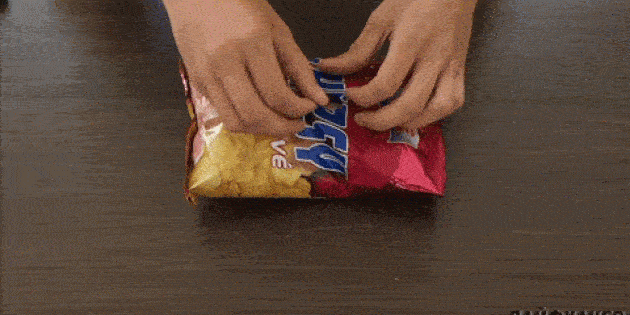 Відкривати пачку можна по-різному. Наприклад, відірвати куточок, розірвати верх або розкрити по всіх швах. Але щоб не вимастити руки приправами, є один перевірений спосіб: покладіть упаковку горизонтально, посередині зробіть дірочку і по колу відірвіть фольгу.