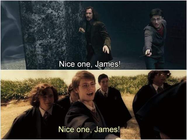 В "Ордені Фенікса" Сіріус каже "Гарно, Джеймсе", коли Гаррі обеззброює Луція Мелфоя. Те саме він сказав батьку Гаррі в попередньому флешбеку