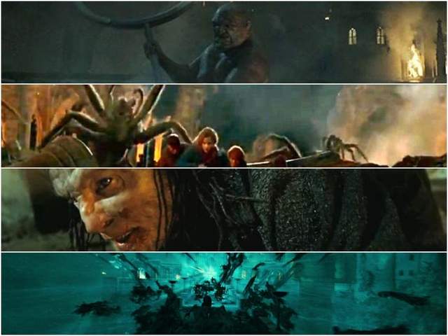 У завершальному фільмі Гаррі, Рон та Герміона борються з павуками, тролями, дементорами і перевертнями – з цими всіма ворогами вони вже зустрічались у перших трьох частинах