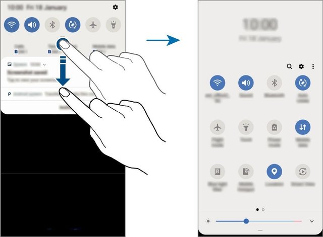 Повне висунення панелі налаштувань. Стандартний "свайп" вниз від верхньої межі екрану покаже тільки повідомлення та верхній ряд піктограм. Щоб швидко висунути всю панель і скористатися налаштуваннями системи, потрібно зробити ще один "свайп" вниз. Але так само є ще один спосіб. Достатньо зробити такий же "свайп", тільки двома пальцями відразу. Такий "подвійний свайп" витягне панель цілком з першого разу.