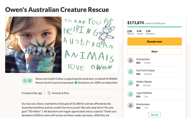 Оуен Коллі, 6-річний хлопчик з Хінгхема, штат Массачусетс (США), почув у дитячому садку про австралійські лісові пожежі два тижні тому. Він запитав, чи постраждали тварини у вогні, і його мама визнала, що так. Саме це й стало причиною того, що він вирішив збирати кошти на порятунок коал.