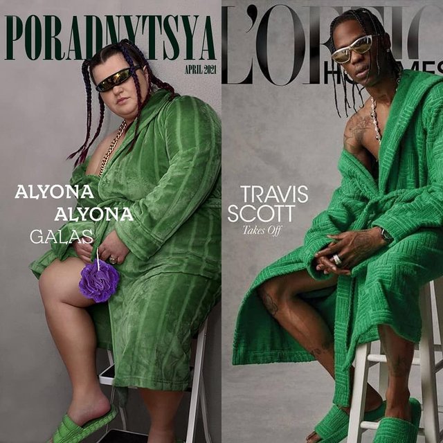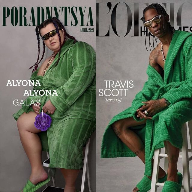 А ще alyona alyona відтворила обкладинку L'Officiel з репером Тревісом Скоттом. Співачка з'явилася в зеленому махровому халаті, сидячи на стільці в сонцезахисних окулярах. Вона оголила плече і взяла в руки мочалку.