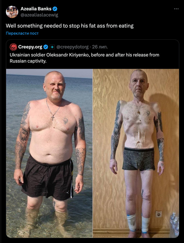 Азілія Бенкс поширила на своїй сторінці колаж із фото Олександра Кірієнка до і після полону. До цього реперка додала принизливий коментар: "Щось мало зупинити його товсту д*пу від їжі".