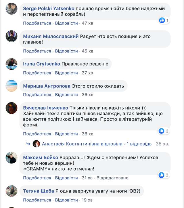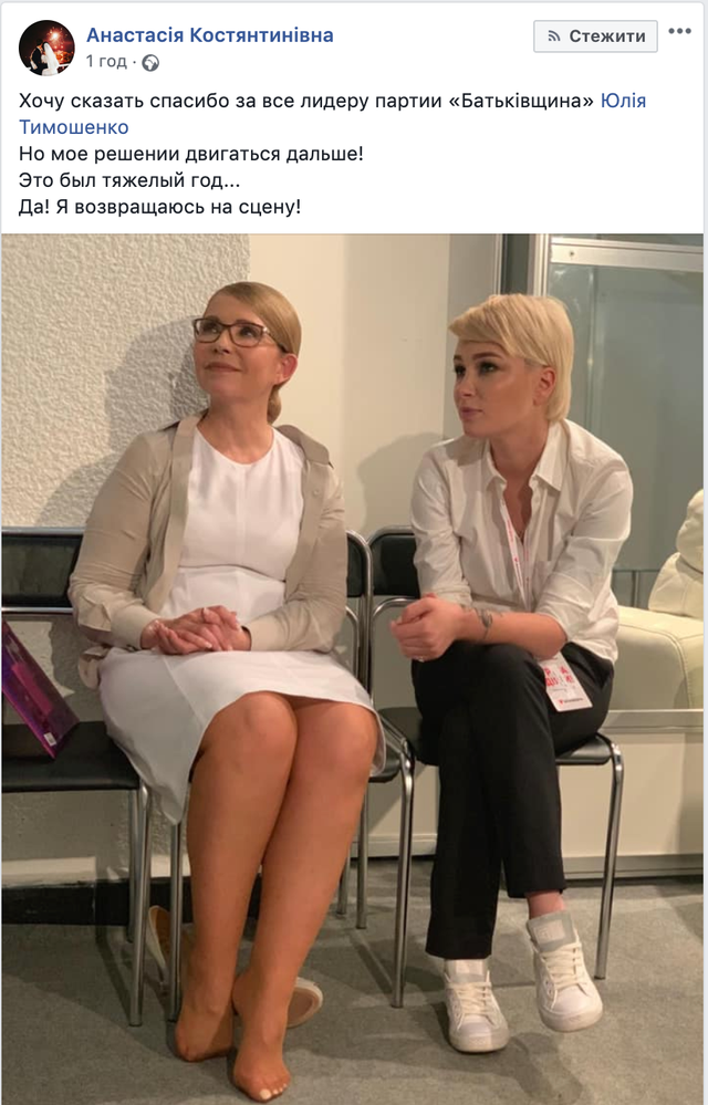 Хочу сказати дякую за все лідеру партії "Батьківщина" Юлії Тимошенко. Але моє рішення – рухатися далі! Це був важкий рік... Так! Я повертаюсь на сцену!, – написала вона.