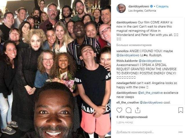 З брюнетки зірка перевтілилась у блондинку. Кадр із знімального майданчика виклав на своїй сторінці в Instagram актор Девід Ойелоуо, який грає батька Пітера і Аліси. На знімку Анджеліну можна впізнати з великими труднощами. Чорна сукня XIX-го століття і світлий парик її сильно змінили.