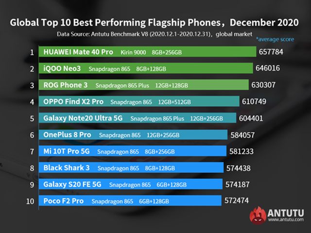 Оскільки Xiaomi Mi11, побудований на базі флагманського процесора Snapdragon 888, зараз офіційно продається тільки в Китаї, лідером міжнародного рейтингу став HUAWEI Mate 40 Pro з 5-нм чипом Kirin 9000, який набрав в AnTuTu 657 784 бали. Друге місце посів iQOO Neo3 (646 016), а замикає трійку лідерів ASUS ROG Phone3 (630 307).