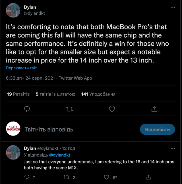 За словами інсайдера, MacBook Pro з діагоналлю 14 і 16 дюймів будуть оснащені однаковим процесором M1X, забезпечуючи таким чином однаковий рівень продуктивності незалежно від розміру.