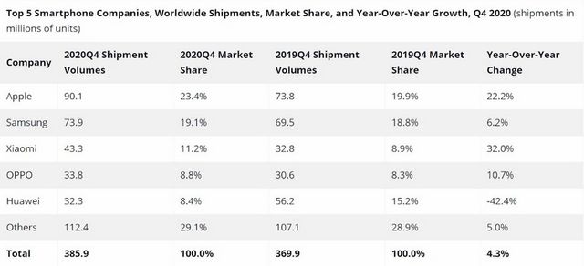 Згідно зі звітом IDC, у четвертому кварталі 2020 року Apple відвантажила 90,1 мільйона смартфонів – на 22,2% більше у порівнянні з аналогічним періодом 2019 року. Це рекордне значення за всю історію ринку. У результаті американська компанія стала найбільшим постачальником смартфонів з часткою ринку 23,4%. Для порівняння, Samsung з жовтня по грудень минулого року відвантажила 73,9 мільйона пристроїв – 19,1% від загальної кількості.