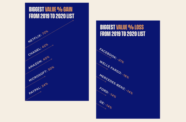 У порівнянні з аналогічним рейтингом 2019 року перша п'ятірка залишилася незмінною. Найдорожчими брендами за рівнем капіталізації залишилися Apple, Google, Microsoft, Amazon і Facebook. Представників IT-індустрії у глобальному рейтингу понад двадцять.