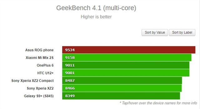 ASUS ROG Phone набирає в одноядерному тесті 2 547 балів, а в багатоядерному – 9 534 бали. Це більше, ніж в OnePlus 6, Xiaomi Mi Mix 2S, HTC U12 Plus і інших смартфонів з тим же процесором.