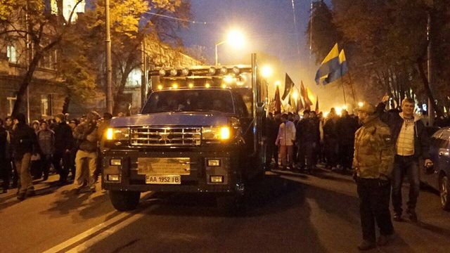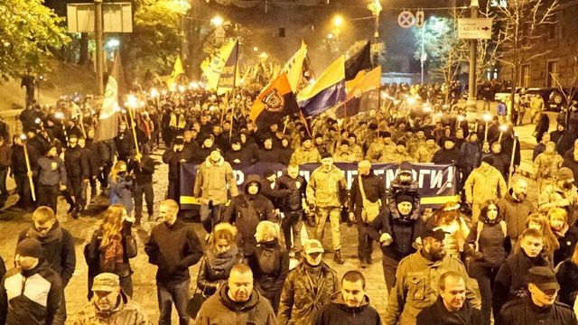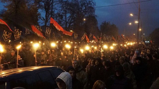 "Марш Нації", у якому беруть участь представники "Азову", громадської організації "С14" та Добровольчого українського корпусу "Правий сектор", прийшов під стіни Києво-Печерської лаври.