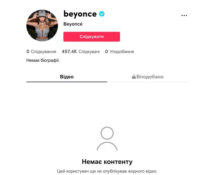 Співачка Бейонсе створила обліковий запис у тіктоку. На нього за добу підписалися понад 457 тисяч користувачів. Поки що вона не виклала жодного ролика та не додала опису.
