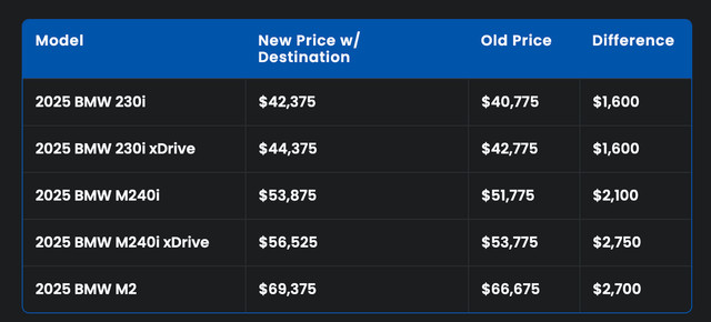 Здається, немає ніяких змін у 2 серії або M2, які б пояснювали нові ціни, принаймні, згідно з інформацією на сайті BMW. Але у виданні є сильна теорія: тарифи. Адміністрація Трампа запровадила загальний 25-відсотковий тариф на всі автомобілі, вироблені за межами США, починаючи з 2 квітня. Купе 2 серії, включаючи M2, що продаються на американському ринку, збираються на заводі BMW в Сан-Луїс-Потосі, Мексика. Тож воно повністю підпадає під дію тарифів.