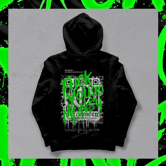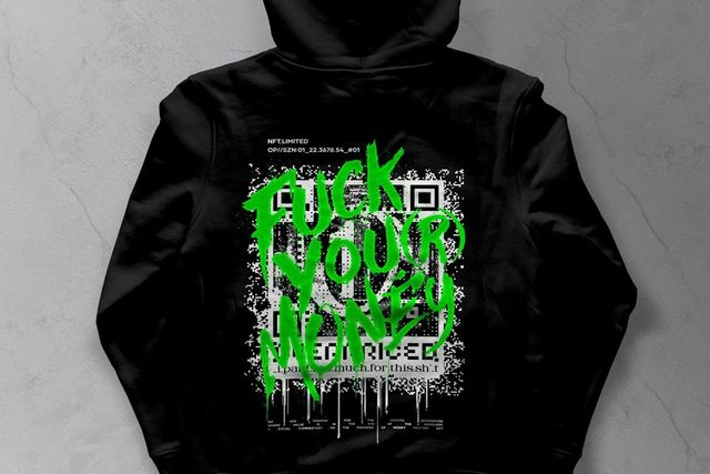 Чорна толстовка з капюшоном і зеленим написом "До біса ваші гроші" була виставлена на майданчику blockparty.co разом з реальною копією, яку можна носити. Дизайнери кажуть, що це "соціальний коментар про божевілля грошей і мистецтва".