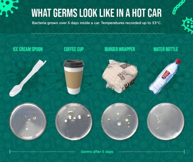 І саме вона сприяє появі різноманітних бактерій. Тому дослідники взяли традиційний набір речей, які частенько залишають в авто (окуляри, монети, спортивний одяг, їжа, чеки, пакети) та простежили, як за кілька днів на їхніх поверхнях розмножуються мікроби в таких умовах.
