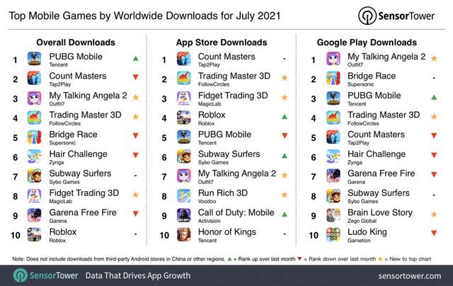 Всього за липень мобільні ігри набрали 4,7 млрд завантажень в App Store і Google Play, що на 2,3% менше, ніж роком раніше. За кількістю завантажень лідирують гравці з Індії (17,2%), США (9,3%) і Бразилії (8,3).
