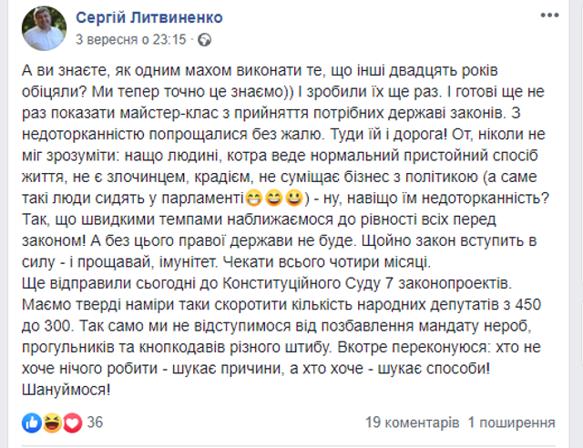 Примітно, що одразу після кнопкодавства Литвиненко опублікував пост у Facebook, де наголосив, що "Слуга народу" запровадить позбавлення нардепа мандата за кнопкодавство.