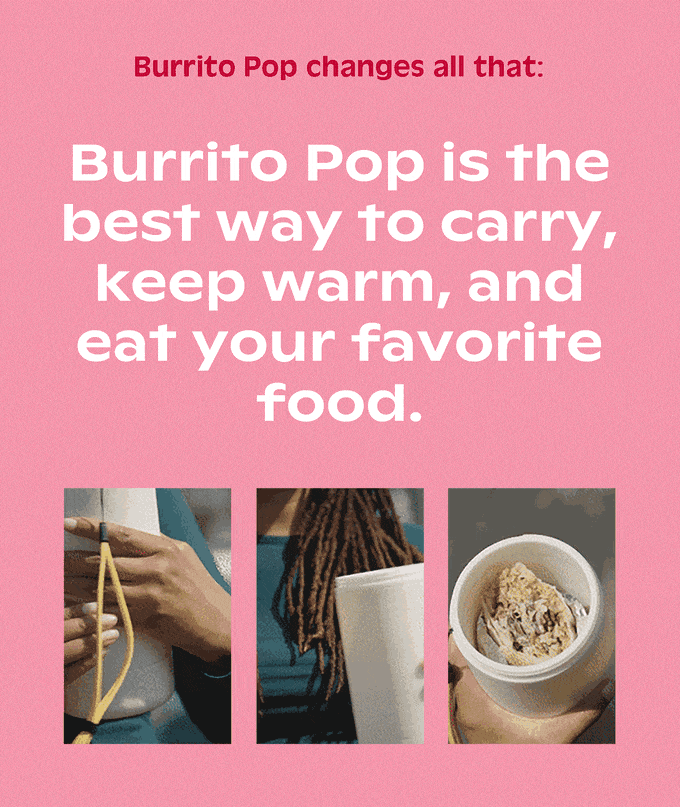 Пристрій називається Burrito Pop, за допомогою нього буріто довше залишається теплим і не розвалюється в руках – все завдяки спеціальному механізму, який підіймає й опускає буріто. Таким чином вуличну їжу можна їсти хоч в машині, хоч над клавіатурою. Сам пристрій можна класти в мікрохвильовку і посудомийну машину.