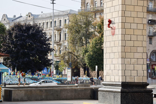 Фігура дитини, яка виходить зі стіни Головпоштамту, щоб намалювати український тризуб, символізує посланця, який прийшов підтримати Україну на місці вшанування українських героїв.