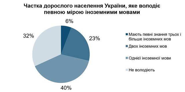 Більшість українців, а саме 68% мають певні знання принаймні однієї іноземної мови, хоча часто ці знання не є глибокими: зокрема 51% українців зазначили що мають деякі знання англійської мови, але детальніший аналіз показує, що тільки 23% можуть читати, писати і спілкуватися цією мовою на побутовому і навіть на професійному рівнях", – йдеться у повідомленні.