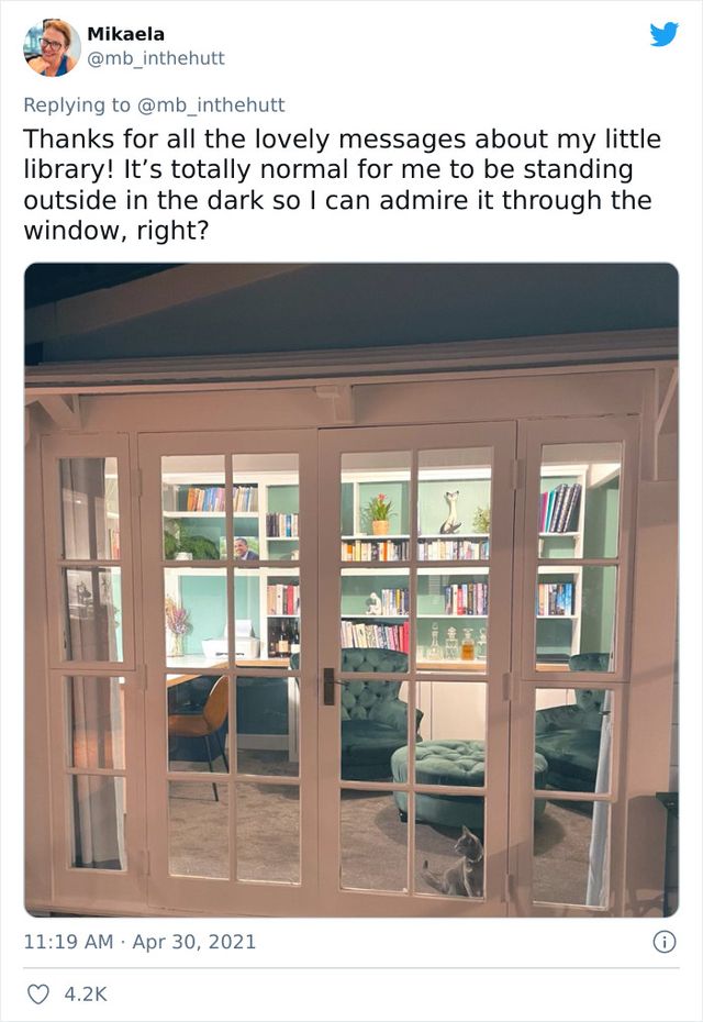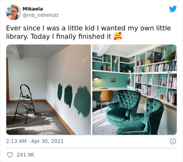 Тому, коли користувачка Твіттера Мікаела поділилась фото своєї свіженької бібліотеки, про які мріяла з дитинства, то запустила справжній флешмоб. Люди не лише із захватом розглядали кімнату, а й ділились власними місцями, де зберігають книги. Відзначимо, що навіть перегляд цих кадрів надихає облаштувати і в себе такий куточок.