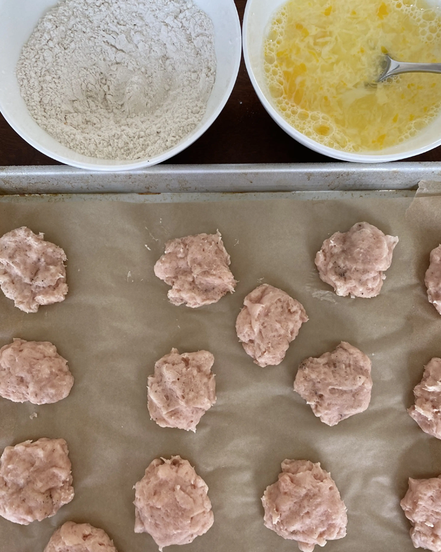 - Приблизно через дві години вийміть курку з морозилки. В одній мисці змішайте сухі інгредієнти: борошно, кукурудзяний крохмаль, цибулеву та часникову пудри. В іншій посудині змішайте інші складники: два яйця і воду. Виваляйте кожен нагетс спершу у "мокрих" інгредієнтах, а тоді в сухих, потім знову у "мокрих" і ще раз у сухих.