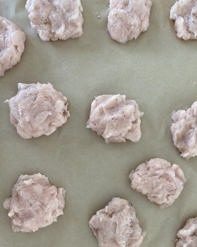 - Як це зробити. Спочатку наріжте курячі грудки невеликими кубиками і переблендеруйте їх. Приправте отриманий фарш сіллю і перцем і сформуйте з нього нагетси. Викладіть їх на пательню, вистелену фольгою або пергаментним папером. Помістіть форму для випічки в морозилку на дві години, щоб курка затверділа.