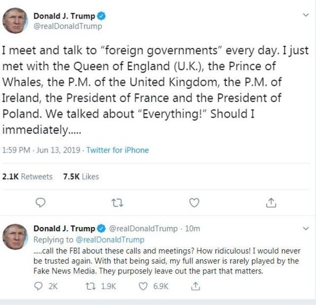 Своїм повідомленням Трамп відповідав на критику громадськості через його інтерв'ю ABC News. У розмові з журналістами американський лідер обмовився, що якби іноземний уряд запропонував йому компромат на його політичного суперника, він би спочатку вислухав інформацію, але не став би неодмінно передавати її ФБР.