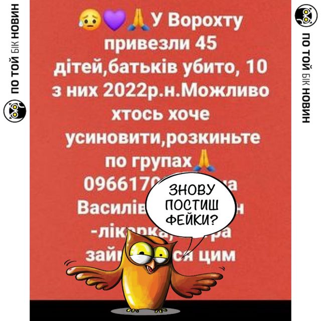 У ворогів України немає нічого святого і брехня про готовність передавати дітей-сиріт у добрі руки, чергове тому підтвердження. Ці пости – відверта брехня, що межує зі злочином. У коментарях, під ними можна побачити чимало охочих, які готові взяти дитинку. Розуміємо. Але хочемо, щоб і кожен дописувач зрозумів – такі повідомлення розраховані на одне – зробити з вас або жертву, або злодія, – наголошують у "По той бік новин".