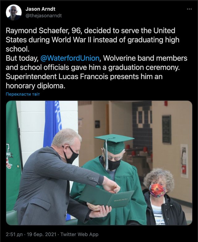 18 березня ветеран Другої світової війни отримав диплом школи Waterford Union у Вісконсині. 77 років тому йому довелося залишити навчання через необхідність утримувати сім'ю та службу в армії.