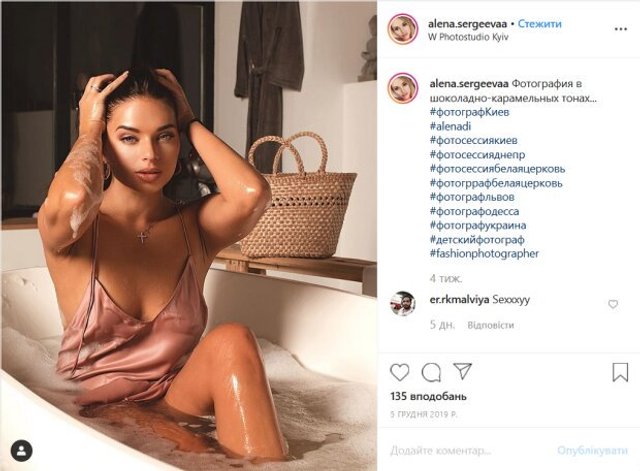 На цих фотографіях Катерина Усик в легкій сукні світло-рожевого кольору сидить у ванній, наповненій водою з густою піною. Також піна на руках в дівчини. "Світлина в шоколадно-карамельних тонах", – так підписала фотосесію Катерини Усик автор фотографій.