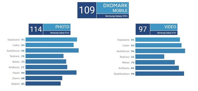 Наявність у Galaxy S10 Plus надширококутного об'єктива не вплинула на оцінку DxOMark. Підсумковий результат флагманського смартфона з урахуванням 97 балів за зйомку відео склав 109 балів, що дозволило йому обійти iPhone XS Max і Xiaomi Mi9, піднявшись на третю сходинку у зведеному рейтингу порталу. Перше і друге місця відстояли Huawei Mate 20 Pro і P20 Pro.