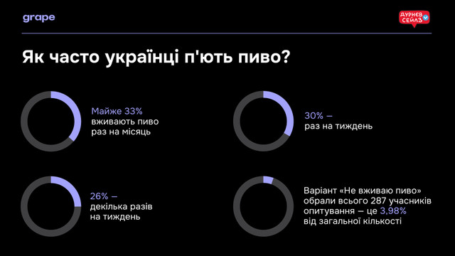 Щотижня пиво вживають 30% опитаних, ще 26% роблять це декілька разів на тиждень. Варіант "не вживаю пиво" обрали 4% опитаних. Серед тих, хто не вживає, досить популярні аргументи: "не вживаю з початку війни" й "не буду вживати до перемоги", відзначають у маркетинговій агенції", – йдеться у повідомленні.