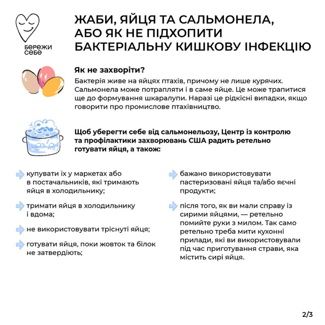 Варто пам'ятати, що бактерія може міститися і на інших продуктах, як-от у сирому м'ясі, овочах, фруктах і навіть процесованих виробах (ковбаса, копчені вироби, сосиски тощо). Проте не слід панікувати! У сучасному світі, якщо ретельно готувати продукти та стежити за гігієною, ризики сальмонельозу не такі й високі", – пишуть експерти.