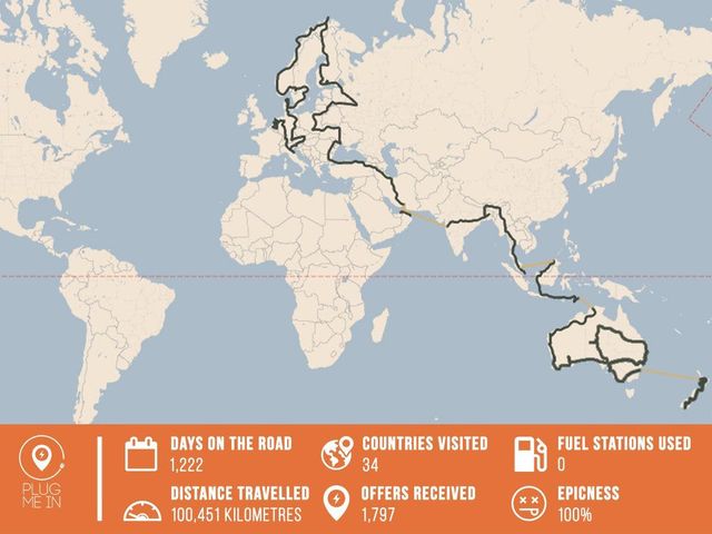 За час подорожі амбітний водій проїхав 95 460 кілометрів по території 33 країн, отримавши понад 1700 пропозицій допомоги на шляху. У дорогу він не взяв з собою ані грошей, ані продовольства, розраховуючи лише на допомогу людей, які цікавляться його поїздкою на веб-сайті проекту Plug Me In.