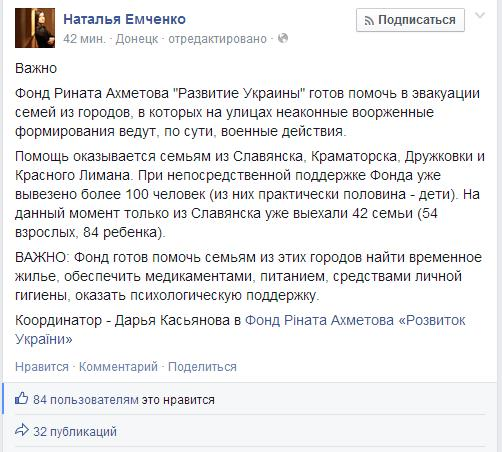 Фонд Ріната Ахметова «Розвиток України» готовий допомогти в евакуації сімей із зони дії АТО, повідомляє у своєму пості в Facebook Наталія Ємченко, директор зі зв'язків з громадськістю та комунікацій СКМ.