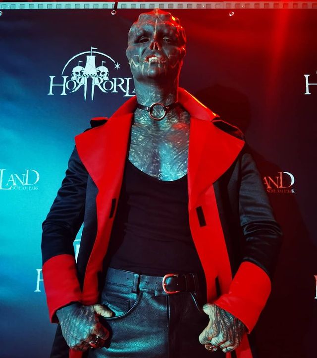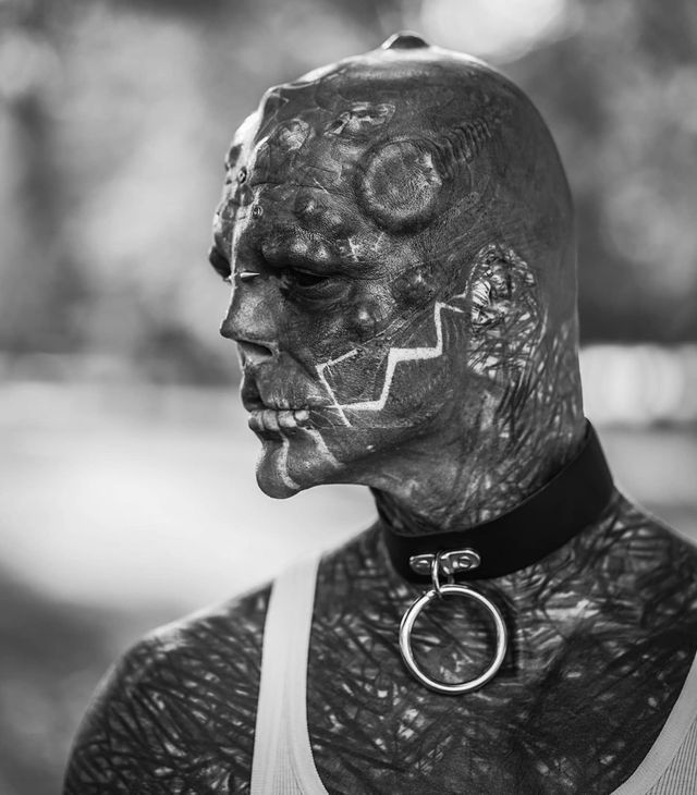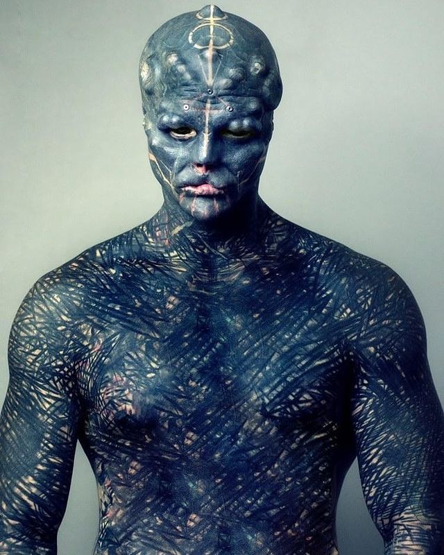 Зокрема, він уже видалив верхню губу, кінчик носа та вуха, розрізав язик і вживив під шкіру обличчя імпланти, що надають його шкірі горбистої текстури та створюють виступи на вилицях. Все тіло француза та очі вкриті татуюваннями.