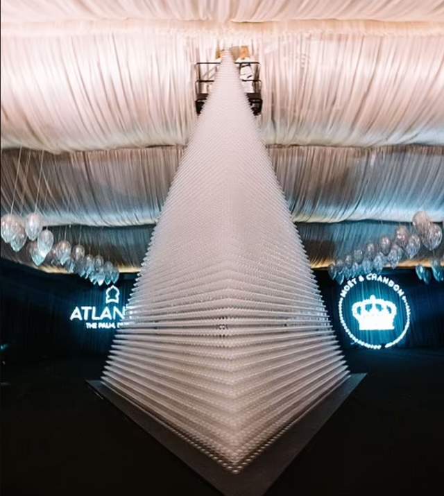 Грандіозна піраміда з келихів для шампанського ввійшла у Книгу рекордів Гіннесса. Побудували її у дубайському готелі Atlantis, The Palm.