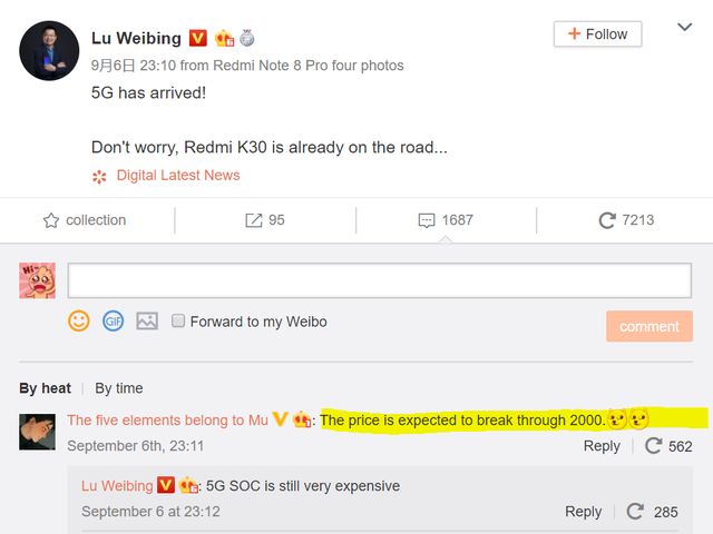 Кілька тижнів тому глава Redmi зазначив, що модель K30 Pro стане першим смартфоном компанії, сумісним з мережами п'ятого покоління. Потім Лю Вейбін вкотре нагадав про новинку, зазначивши, що гаджет вже майже готовий. Тепер же він побічно вказав на вартість пристрою з 5G.