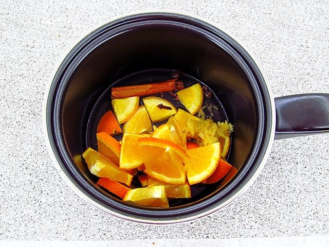 - Коли глінтвейн досяг необхідної температури, в каструлю відправляємо часточки мандаринів. Акуратно все перемішуємо і знімаємо з плити.