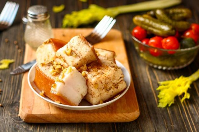 - Поєднуйте сало з картоплею, хлібом, кашею – крохмалистими продуктами, а також гострими спеціями. Так жири будуть засвоюватись краще. Можна додавати і моркву, помідори, а також заїдати борщ.