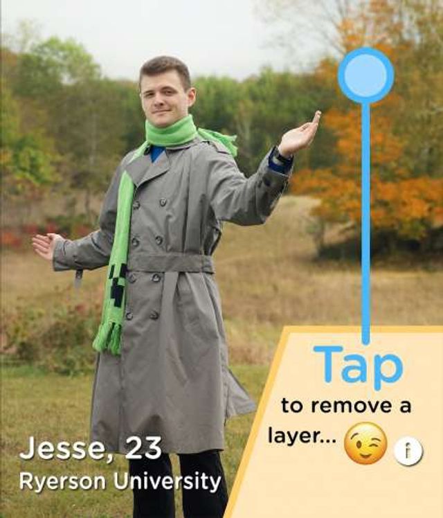 Знайомтесь, це 23-річний Джессі Міллс, який працює веб дизайнером у Торонто. Йому здалося, що надто нудно показувати у додатку для знайомств Tinder традиційні фото на фоні машин, природи та іншого. Тому він вирішив зробити собі незвичайну фотосесію. Знімки опинилися у додатку і дівчатам пропонується провести по сторінці, щоб "зняти шар". З кожним шаром Джессі на фото поступово позбувається одягу. І все б нічого, але інколи це заходить надто далеко. Готові?