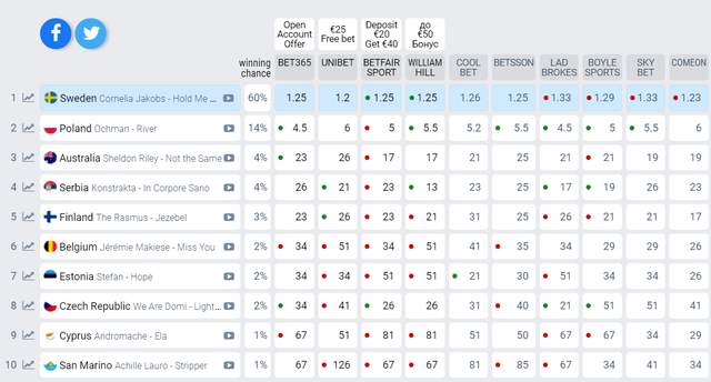 А тим часом букмекери представили 10 учасників другого півфіналу, які, найімовірніше матимуть змогу поборотися за заповітну статуетку. Прогноз оснований на аналізі глядацьких симпатій.