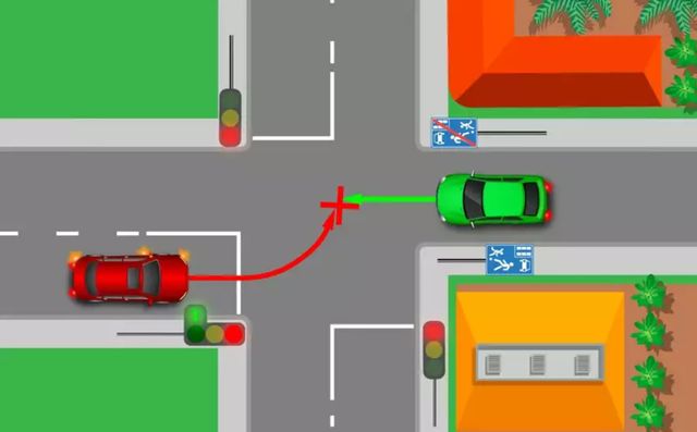 Отож, водії червоного та зеленого автомобілів одночасно виїхали на перехрестя. І майже у центрі перехрестя сталося зіткнення. На перший погляд, ситуація справді спірна. Проте є пункт ПДР, про який вони обидва забули.
