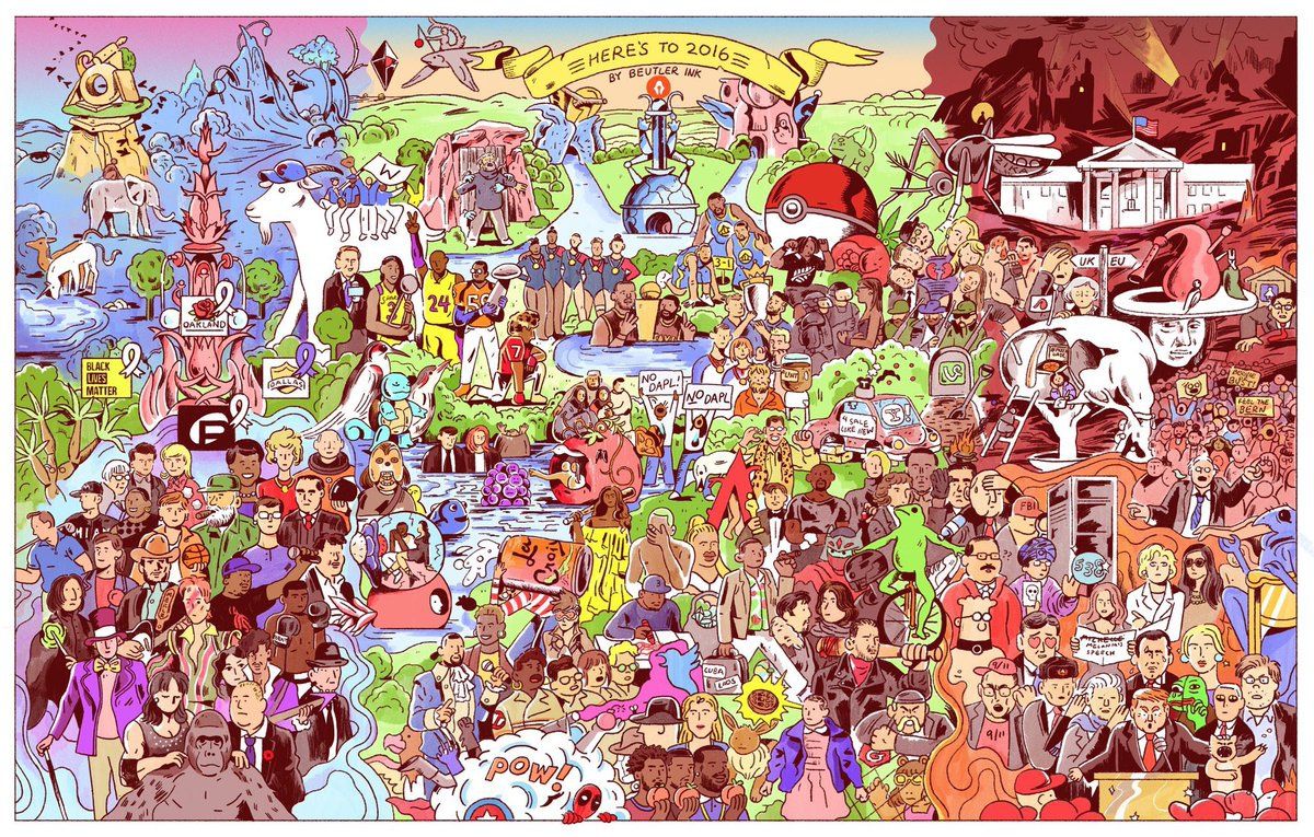 На малюнку зображені добрі душі, яких втратили в 2016 році, а також "злий" диктатор. Також намальовані великі культурні заходи, трагедії, спортивні події та, звичайно ж, політика.